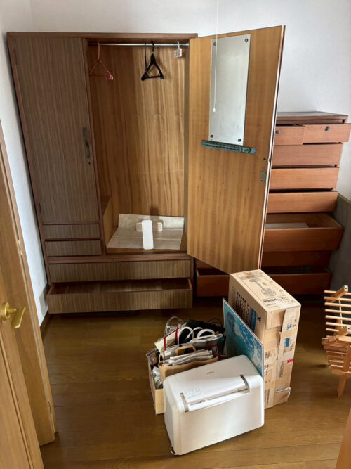 特に問題となったのがタンスです。階段幅が狭く、通常の状態ではそのまま降ろすことができなかったため、現地で解体作業を行いました。タンスを丁寧に分解し、部材ごとに運び出すことで、安全かつスムーズな搬出を実現しています。解体作業を含めた搬出でしたが、スタッフ間で役割分担を行ったことで作業は滞ることなく進みました。