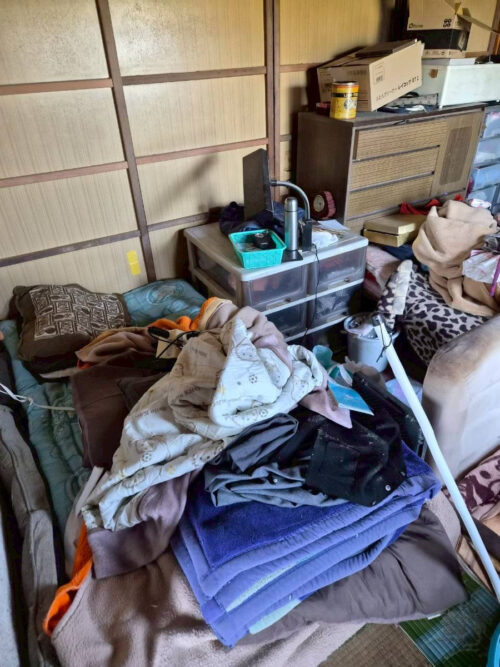 作業当日はスタッフ4名で現場に伺い、まずはお部屋全体の状況を確認しました。室内には家具や生活用品に加え、タンスの中や押し入れの奥にも多くの物が収納されており、単純な搬出作業ではなく、丁寧な仕分け作業が必要な現場でした。